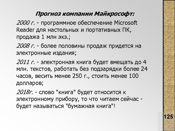 Прогноз компании Майкрософт: 2000 г. - программное обеспечение Microsoft Reader для настольных и портативных ПК, продажа 1 млн экз. ; 2008 г. - более половины продаж придется на электронные издания; 2011 г. - электронная книга будет вмещать до 4 млн. текстов, работать без подзарядки более 24 часов, весить менее 250 г. , стоить менее 100 долларов; 2018 г. - слово "книга" будет относится к электронному прибору, то читаем сейчас будет называться "бумажная книга"! 125