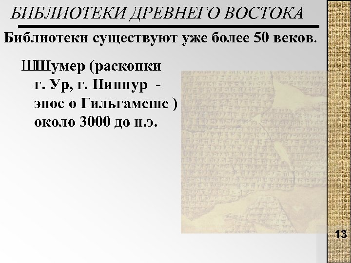 БИБЛИОТЕКИ ДРЕВНЕГО ВОСТОКА Библиотеки существуют уже более 50 веков. ШШумер (раскопки г. Ур, г. Ниппур - эпос о Гильгамеше ) около 3000 до н. э. 13