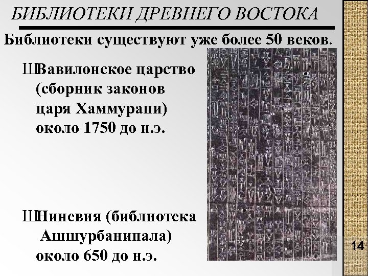 БИБЛИОТЕКИ ДРЕВНЕГО ВОСТОКА Библиотеки существуют уже более 50 веков. ШВавилонское царство (сборник законов царя Хаммурапи) около 1750 до н. э. ШНиневия (библиотека Ашшурбанипала) около 650 до н. э. 14