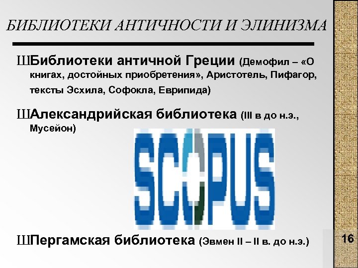БИБЛИОТЕКИ АНТИЧНОСТИ И ЭЛИНИЗМА ШБиблиотеки античной Греции (Демофил – «О книгах, достойных приобретения» , Аристотель, Пифагор, тексты Эсхила, Софокла, Еврипида) ШАлександрийская библиотека (III в до н. э. , Мусейон) ШПергамская библиотека (Эвмен II – II в. до н. э. ) 16