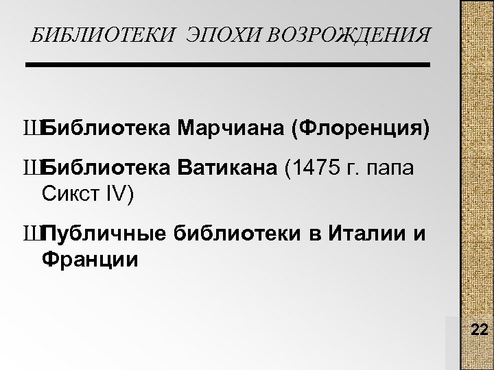 БИБЛИОТЕКИ ЭПОХИ ВОЗРОЖДЕНИЯ ШБиблиотека Марчиана (Флоренция) ШБиблиотека Ватикана (1475 г. папа Сикст IV) ШПубличные библиотеки в Италии и Франции 22