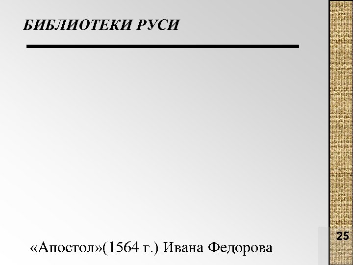 БИБЛИОТЕКИ РУСИ «Апостол» (1564 г. ) Ивана Федорова 25