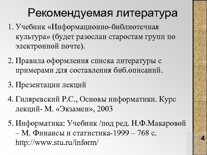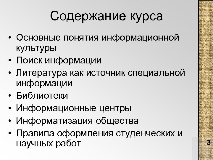 Содержание курса • Основные понятия информационной культуры • Поиск информации • Литература как источник специальной информации • Библиотеки • Информационные центры • Информатизация общества • Правила оформления студенческих и научных работ 3