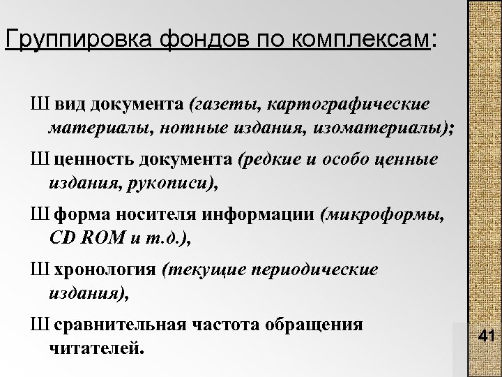 Группировка фондов по комплексам: Ш вид документа (газеты, картографические материалы, нотные издания, изоматериалы); Ш ценность документа (редкие и особо ценные издания, рукописи), Ш форма носителя информации (микроформы, CD ROM и т. д. ), Ш хронология (текущие периодические издания), Ш сравнительная частота обращения читателей. 41
