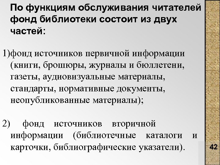 По функциям обслуживания читателей фонд библиотеки состоит из двух частей: 1)фонд источников первичной информации (книги, брошюры, журналы и бюллетени, газеты, аудиовизуальные материалы, стандарты, нормативные документы, неопубликованные материалы); 2) фонд источников вторичной информации (библиотечные каталоги и карточки, библиографические указатели). 42