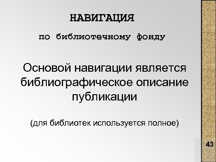 НАВИГАЦИЯ по библиотечному фонду Основой навигации является библиографическое описание публикации (для библиотек используется полное) 43