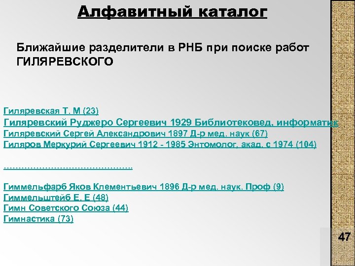 Алфавитный каталог Ближайшие разделители в РНБ при поиске работ ГИЛЯРЕВСКОГО Гиляревская Т. М (23) Гиляревский Руджеро Сергеевич 1929 Библиотековед, информатик Гиляревский Сергей Александрович 1897 Д-р мед. наук (67) Гиляров Меркурий Сергеевич 1912 - 1985 Энтомолог, акад. с 1974 (104) …………………. . Гиммельфарб Яков Клементьевич 1896 Д-р мед. наук. Проф (9) Гиммельштейб Е. Е (48) Гимн Советского Союза (44) Гимнастика (73) 47