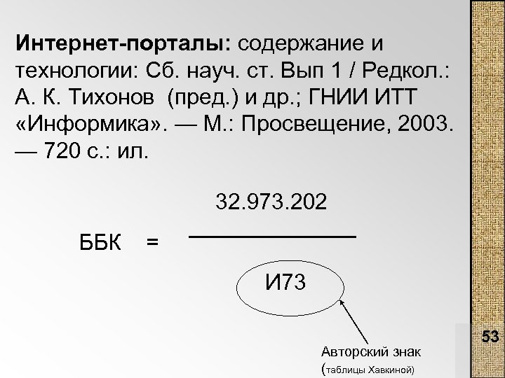 Интернет-порталы: содержание и технологии: Сб. науч. ст. Вып 1 / Редкол. : A. К. Тихонов (пред. ) и др. ; ГНИИ ИТТ «Информика» . — М. : Просвещение, 2003. — 720 с. : ил. 32. 973. 202 ББК = И 73 Авторский знак (таблицы Хавкиной) 53
