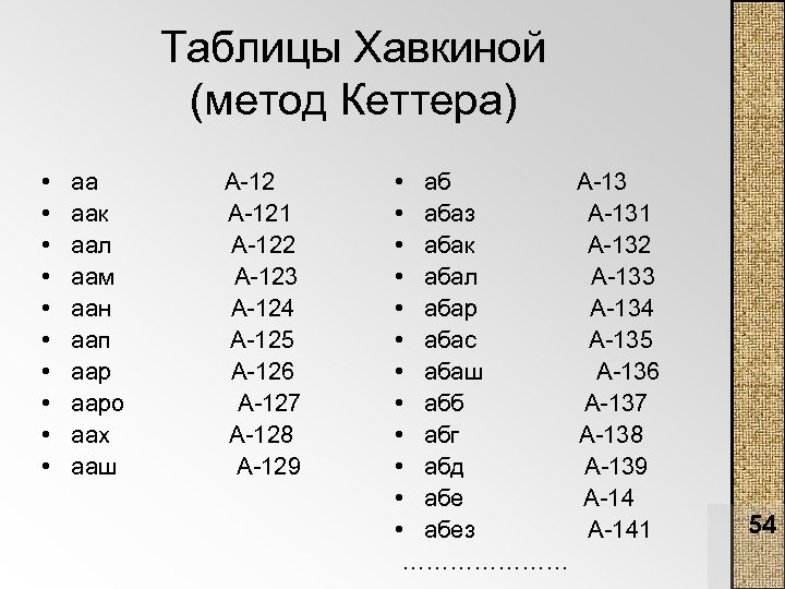 Таблицы Хавкиной (метод Кеттера) • • • аа А-12 аак А-121 аал А-122 аам А-123 аан А-124 аап А-125 аар А-126 ааро А-127 аах А-128 ааш А-129 • аб А-13 • абаз А-131 • абак А-132 • абал А-133 • абар А-134 • абас А-135 • абаш А-136 • абб А-137 • абг А-138 • абд А-139 • абе А-14 • абез А-141 ………………… 54