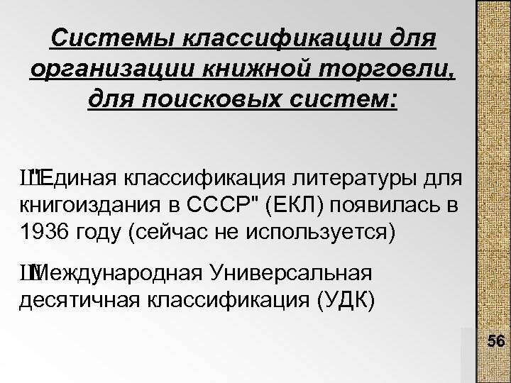 Системы классификации для организации книжной торговли, для поисковых систем: Ш "Единая классификация литературы для книгоиздания в СССР" (ЕКЛ) появилась в 1936 году (сейчас не используется) Ш Международная Универсальная десятичная классификация (УДК) 56
