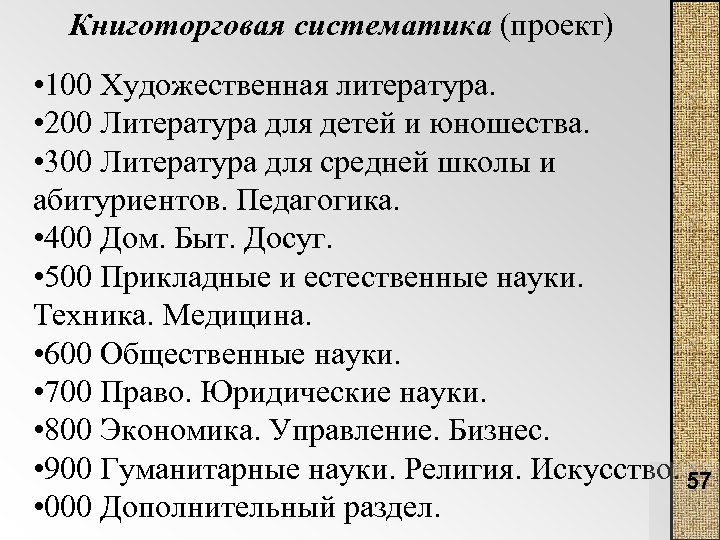 Книготорговая систематика (проект) • 100 Художественная литература. • 200 Литература для детей и юношества. • 300 Литература для средней школы и абитуриентов. Педагогика. • 400 Дом. Быт. Досуг. • 500 Прикладные и естественные науки. Техника. Медицина. • 600 Общественные науки. • 700 Право. Юридические науки. • 800 Экономика. Управление. Бизнес. • 900 Гуманитарные науки. Религия. Искусство. 57 • 000 Дополнительный раздел.