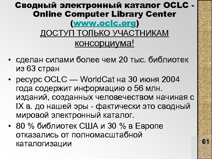Сводный электронный каталог OCLC Online Computer Library Center (www. oclc. org) ДОСТУП ТОЛЬКО УЧАСТНИКАМ консорциума! • сделан силами более чем 20 тыс. библиотек из 63 стран • ресурс OCLC — World. Cat на 30 июня 2004 года содержит информацию о 56 млн. изданий, созданных человечеством начиная с IX в. до нашей эры - фактически это сводный мировой электронный каталог. • 80 % библиотек США и 30 % в Европе отказались от полномасштабной 61 каталогизации