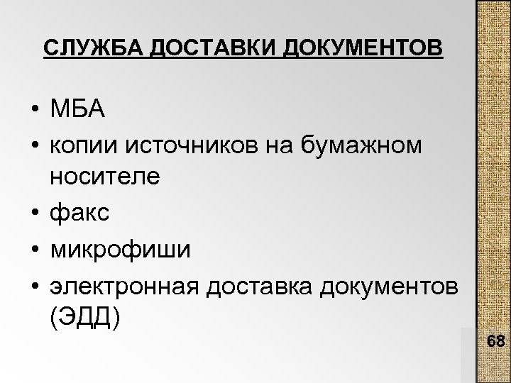 СЛУЖБА ДОСТАВКИ ДОКУМЕНТОВ • МБА • копии источников на бумажном носителе • факс • микрофиши • электронная доставка документов (ЭДД) 68