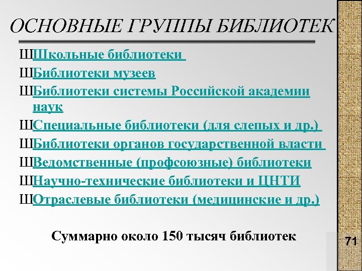 ОСНОВНЫЕ ГРУППЫ БИБЛИОТЕК ШШкольные библиотеки ШБиблиотеки музеев ШБиблиотеки системы Российской академии наук ШСпециальные библиотеки (для слепых и др. ) ШБиблиотеки органов государственной власти ШВедомственные (профсоюзные) библиотеки ШНаучно-технические библиотеки и ЦНТИ ШОтраслевые библиотеки (медицинские и др. ) Суммарно около 150 тысяч библиотек 71