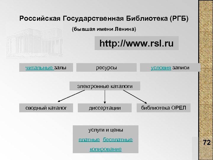 Российская Государственная Библиотека (РГБ) (бывшая имени Ленина) http: //www. rsl. ru читальные залы ресурсы условия записи электронные каталоги сводный каталог диссертации библиотека ОРЕЛ услуги и цены платные бесплатные копирование 72