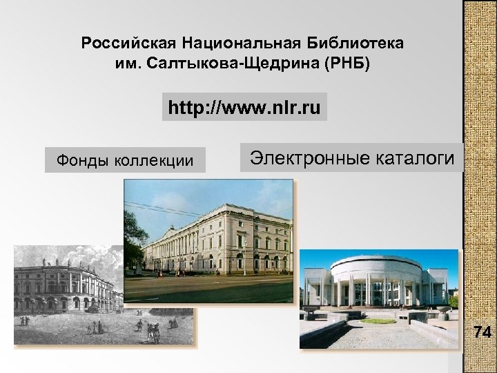 Российская Национальная Библиотека им. Салтыкова-Щедрина (РНБ) http: //www. nlr. ru Фонды коллекции Электронные каталоги 74