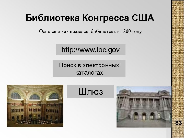 Библиотека Конгресса США Основана как правовая библиотека в 1800 году http: //www. loc. gov Поиск в электронных каталогах Шлюз 83