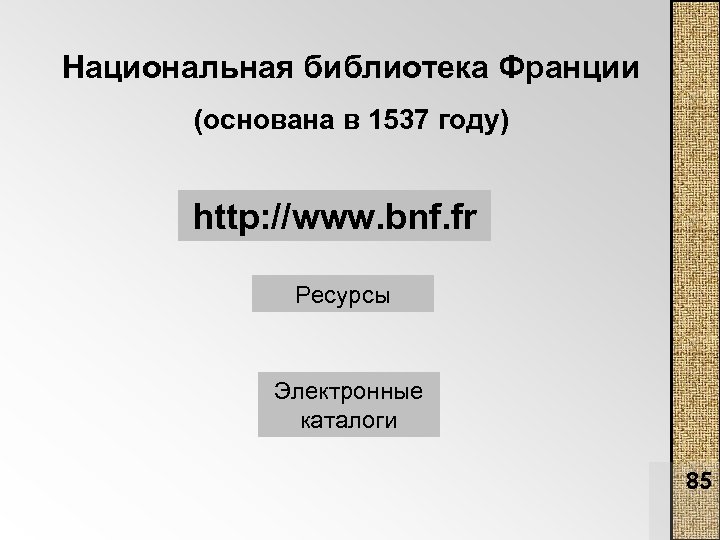 Национальная библиотека Франции (основана в 1537 году) http: //www. bnf. fr Ресурсы Электронные каталоги 85
