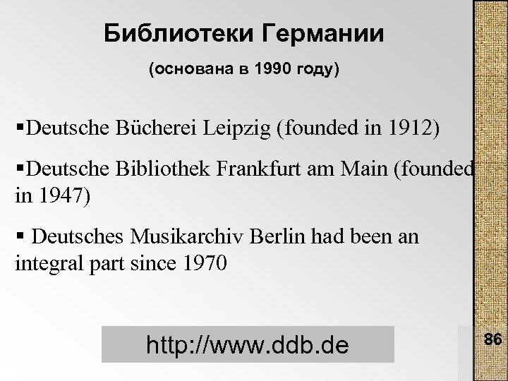 Библиотеки Германии (основана в 1990 году) §Deutsche Bücherei Leipzig (founded in 1912) §Deutsche Bibliothek Frankfurt am Main (founded in 1947) § Deutsches Musikarchiv Berlin had been an integral part since 1970 http: //www. ddb. de 86