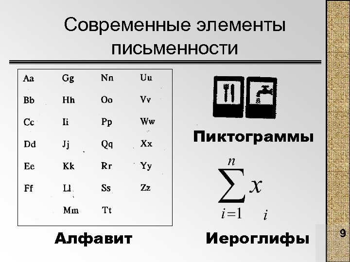 Современные элементы письменности Пиктограммы Алфавит Иероглифы 9