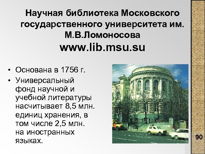 Научная библиотека Московского государственного университета им. М. В. Ломоносова www. lib. msu. su • Основана в 1756 г. • Универсальный фонд научной и учебной литературы насчитывает 8, 5 млн. единиц хранения, в том числе 2, 5 млн. на иностранных языках. 90