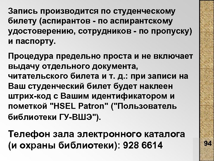 Запись производится по студенческому билету (аспирантов - по аспирантскому удостоверению, сотрудников - по пропуску) и паспорту. Процедура предельно проста и не включает выдачу отдельного документа, читательского билета и т. д. : при записи на Ваш студенческий билет будет наклеен штрих-код с Вашим идентификатором и пометкой "HSEL Patron" ("Пользователь библиотеки ГУ-ВШЭ"). Телефон зала электронного каталога (и охраны библиотеки): 928 6614 94