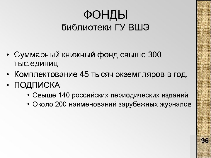 ФОНДЫ библиотеки ГУ ВШЭ • Суммарный книжный фонд свыше 300 тыс. единиц • Комплектование 45 тысяч экземпляров в год. • ПОДПИСКА • Свыше 140 российских периодических изданий • Около 200 наименований зарубежных журналов 96