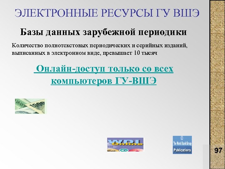 ЭЛЕКТРОННЫЕ РЕСУРСЫ ГУ ВШЭ Базы данных зарубежной периодики Количество полнотекстовых периодических и серийных изданий, выписанных в электронном виде, превышает 10 тысяч Онлайн-доступ только со всех компьютеров ГУ-ВШЭ 97