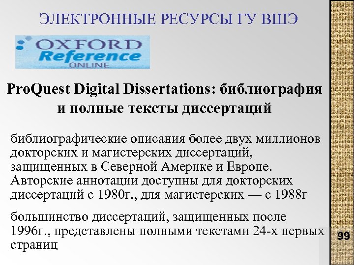 ЭЛЕКТРОННЫЕ РЕСУРСЫ ГУ ВШЭ Pro. Quest Digital Dissertations: библиография и полные тексты диссертаций библиографические описания более двух миллионов докторских и магистерских диссертаций, защищенных в Северной Америке и Европе. Авторские аннотации доступны для докторских диссертаций с 1980 г. , для магистерских — с 1988 г большинство диссертаций, защищенных после 1996 г. , представлены полными текстами 24 х первых 99 страниц