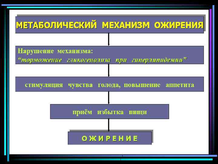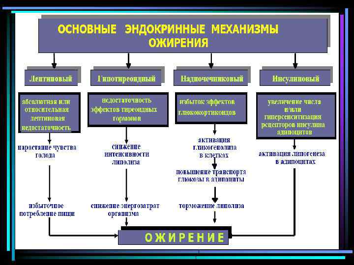 Основные звенья патогенеза ожирения Нейрогенные Центрогенный Гипоталамический Эндокринные Метаболические Лептиновый Инсулиновый Гипотиреоидный Надпочечниковый
