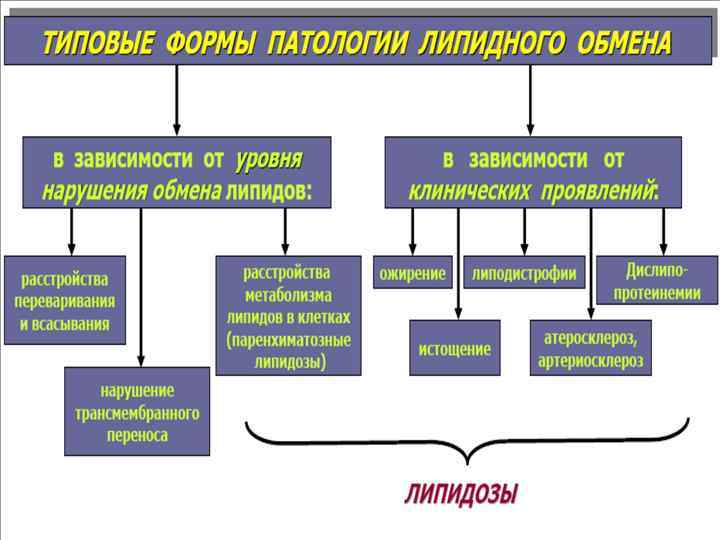 Липидозы – типовая форма патологии липидного обмена. Характеризуется расстройством метаболизма липидов: • в клетках (паренхиматозные липидозы) • в адипоцитах (истощение, ожирение, липодистрофии) • в крови (дислипидемии) • в стенках артерий (атеро-, артериосклероз).