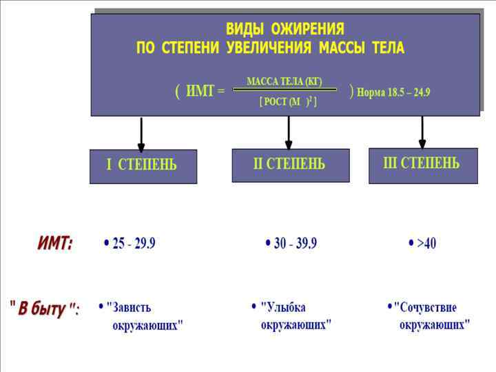 Ожирение – патологический избыток триглицеридов в организме. Классификация ожирения. • По генезу: 1. Первичное (гипоталамическое) – нейроэндокринный генез. 2. Вторичное (симптоматическое). • По преимущественному увеличению числа или размеров адипоцитов: гиперпластическое, гипертрофическое, смешанное. • По локализации жировой ткани в организме: 1. общее (равномерное); 2. местное (локальная липогипертрофия): женский тип, мужской тип. • По увеличению массы тела.