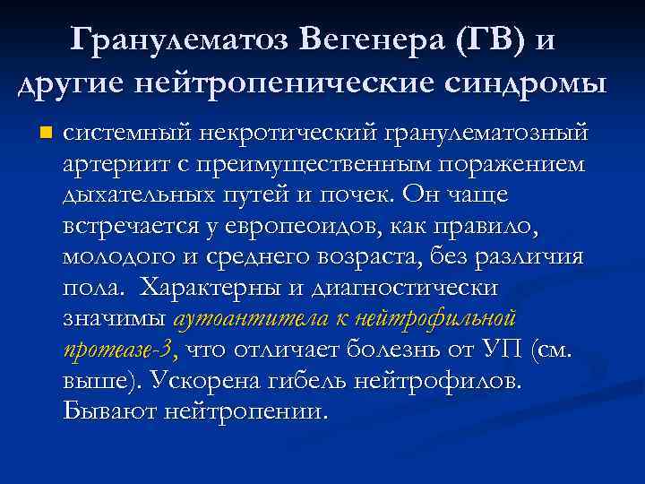 Гранулематоз Вегенера (ГВ) и другие нейтропенические синдромы n системный некротический гранулематозный артериит с преимущественным поражением дыхательных путей и почек. Он чаще встречается у европеоидов, как правило, молодого и среднего возраста, без различия пола. Характерны и диагностически значимы аутоантитела к нейтрофильной протеазе-3, что отличает болезнь от УП (см. выше). Ускорена гибель нейтрофилов. Бывают нейтропении.