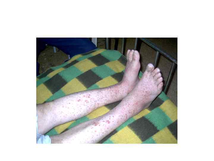 Кожные высыпания • Пурпура - кожные кровоизлияния, обусловленные нарушениями свёртываемости крови или проницаемости капилляров, наблюдается при болезни Верльгофа, гемофилии, цинге, капилляротоксикозе, механической желтухе.