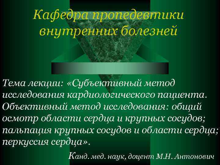 Кафедра пропедевтики внутренних болезней Тема лекции: «Субъективный метод исследования кардиологического пациента. Объективный метод исследования: общий осмотр области сердца и крупных сосудов; пальпация крупных сосудов и области сердца; перкуссия сердца» . Канд. мед. наук, доцент М. Н. Антонович