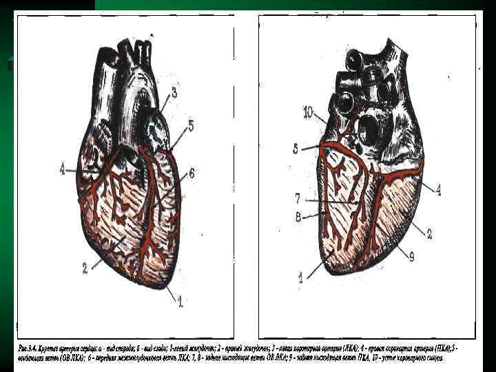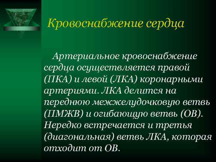 Кровоснабжение сердца Артериальное кровоснабжение сердца осуществляется правой (ПКА) и левой (ЛКА) коронарными артериями. ЛКА делится на переднюю межжелудочковую ветвь (ПМЖВ) и огибающую ветвь (ОВ). Нередко встречается и третья (диагональная) ветвь ЛКА, которая отходит от ОВ.