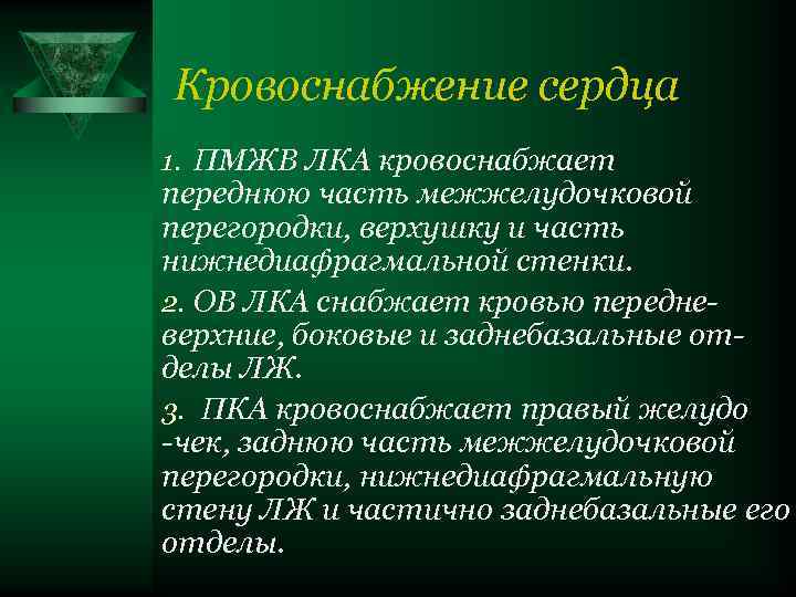 Кровоснабжение сердца 1. ПМЖВ ЛКА кровоснабжает переднюю часть межжелудочковой перегородки, верхушку и часть нижнедиафрагмальной стенки. 2. ОВ ЛКА снабжает кровью передневерхние, боковые и заднебазальные отделы ЛЖ. 3. ПКА кровоснабжает правый желудо -чек, заднюю часть межжелудочковой перегородки, нижнедиафрагмальную стену ЛЖ и частично заднебазальные его отделы.