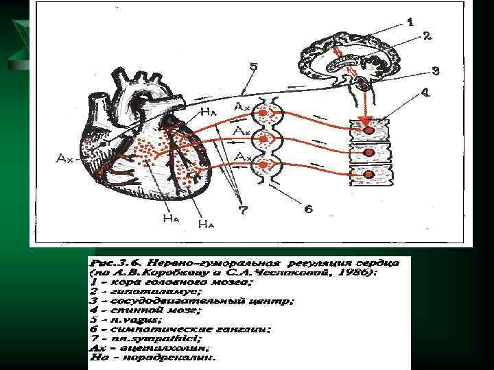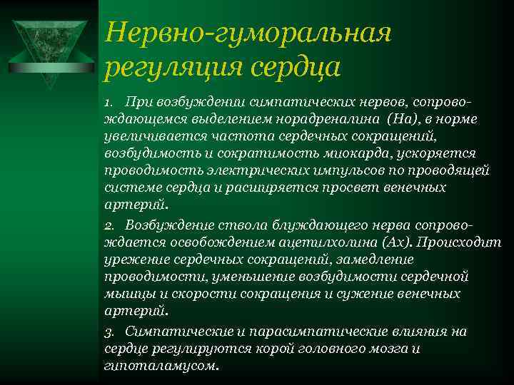 Нервно-гуморальная регуляция сердца 1. При возбуждении симпатических нервов, сопрово- ждающемся выделением норадреналина (На), в норме увеличивается частота сердечных сокращений, возбудимость и сократимость миокарда, ускоряется проводимость электрических импульсов по проводящей системе сердца и расширяется просвет венечных артерий. 2. Возбуждение ствола блуждающего нерва сопровождается освобождением ацетилхолина (Ах). Происходит урежение сердечных сокращений, замедление проводимости, уменьшение возбудимости сердечной мышцы и скорости сокращения и сужение венечных артерий. 3. Симпатические и парасимпатические влияния на сердце регулируются корой головного мозга и гипоталамусом.