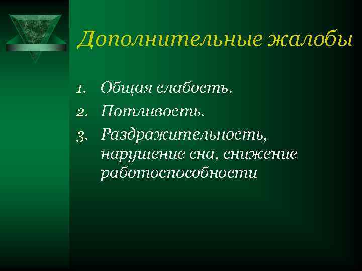 Дополнительные жалобы 1. Общая слабость. 2. Потливость. 3. Раздражительность, нарушение сна, снижение работоспособности