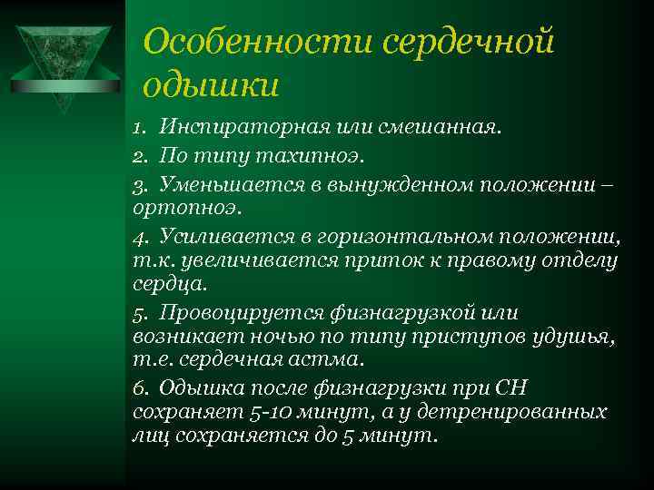 Особенности сердечной одышки 1. Инспираторная или смешанная. 2. По типу тахипноэ. 3. Уменьшается в вынужденном положении – ортопноэ. 4. Усиливается в горизонтальном положении, т. к. увеличивается приток к правому отделу сердца. 5. Провоцируется физнагрузкой или возникает ночью по типу приступов удушья, т. е. сердечная астма. 6. Одышка после физнагрузки при СН сохраняет 5 -10 минут, а у детренированных лиц сохраняется до 5 минут.