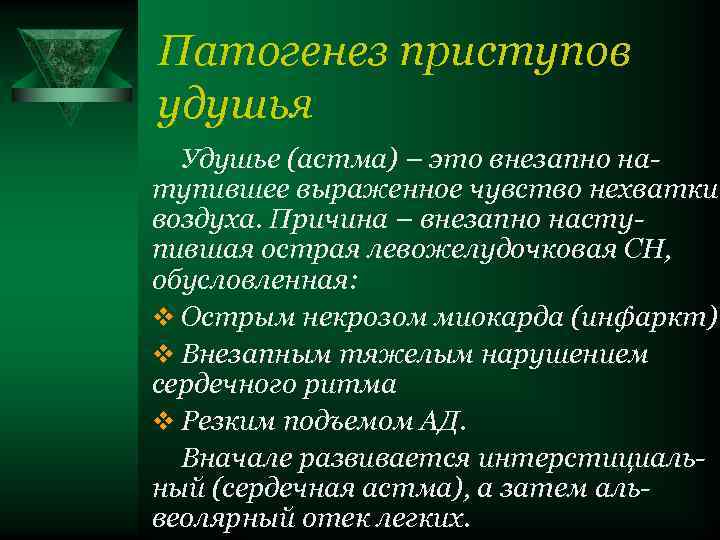 Патогенез приступов удушья Удушье (астма) – это внезапно натупившее выраженное чувство нехватки воздуха. Причина – внезапно наступившая острая левожелудочковая СН, обусловленная: v Острым некрозом миокарда (инфаркт) v Внезапным тяжелым нарушением сердечного ритма v Резким подъемом АД. Вначале развивается интерстициальный (сердечная астма), а затем альвеолярный отек легких.