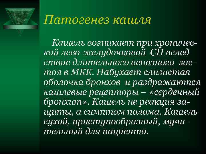 Патогенез кашля Кашель возникает при хронической лево-желудочковой СН вследствие длительного венозного застоя в МКК. Набухает слизистая оболочка бронхов и раздражаются кашлевые рецепторы – «сердечный бронхит» . Кашель не реакция защиты, а симптом полома. Кашель сухой, приступообразный, мучительный для пациента.