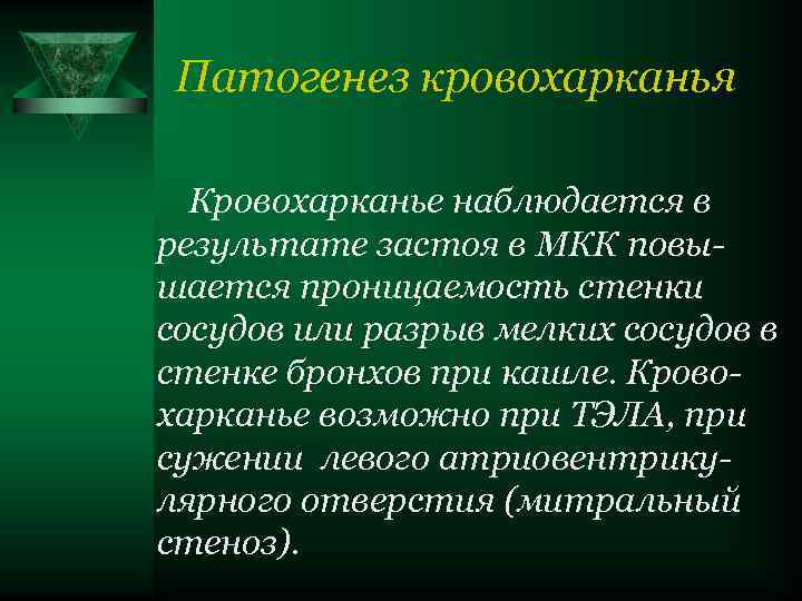 Патогенез кровохарканья Кровохарканье наблюдается в результате застоя в МКК повышается проницаемость стенки сосудов или разрыв мелких сосудов в стенке бронхов при кашле. Кровохарканье возможно при ТЭЛА, при сужении левого атриовентрикулярного отверстия (митральный стеноз).