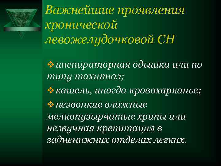 Важнейшие проявления хронической левожелудочковой СН v инспираторная одышка или по типу тахипноэ; v кашель, иногда кровохарканье; v незвонкие влажные мелкопузырчатые хрипы или незвучная крепитация в задненижних отделах легких.