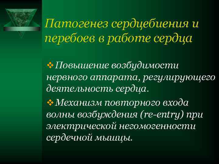 Патогенез сердцебиения и перебоев в работе сердца v Повышение возбудимости нервного аппарата, регулирующего деятельность сердца. v Механизм повторного входа волны возбуждения (re-entry) при электрической негомогенности сердечной мышцы.