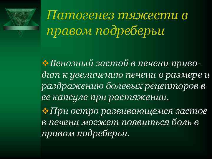 Патогенез тяжести в правом подреберьи v Венозный застой в печени приво- дит к увеличению печени в размере и раздражению болевых рецепторов в ее капсуле при растяжении. v При остро развивающемся застое в печени могжет появиться боль в правом подреберьи.