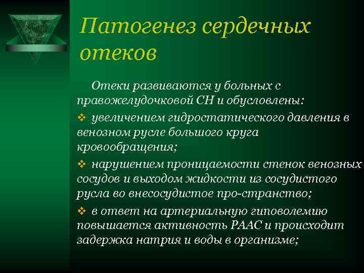 Патогенез сердечных отеков Отеки развиваются у больных с правожелудочковой СН и обусловлены: v увеличением гидростатического давления в венозном русле большого круга кровообращения; v нарушением проницаемости стенок венозных сосудов и выходом жидкости из сосудистого русла во внесосудистое про-странство; v в ответ на артериальную гиповолемию повышается активность РААС и происходит задержка натрия и воды в организме;