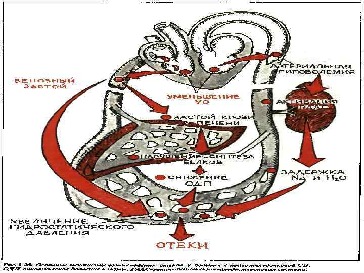 Патогенез сердечных отеков v снижением онкотического давления плазмы в результате застоя крови в печени и нарушения синтеза белков; v развившаяся гиповолемия приводит к раздражению волюморецепторов ЮГА почек и усилению секреции антидиуретического гормона гипофиза, что способствует еще большей задержке жидкости в организме и увеличению отеков. Эндокринный компонент в патогенезе сердечных отеков вторичный в результате первичного расстройства кровообращения.