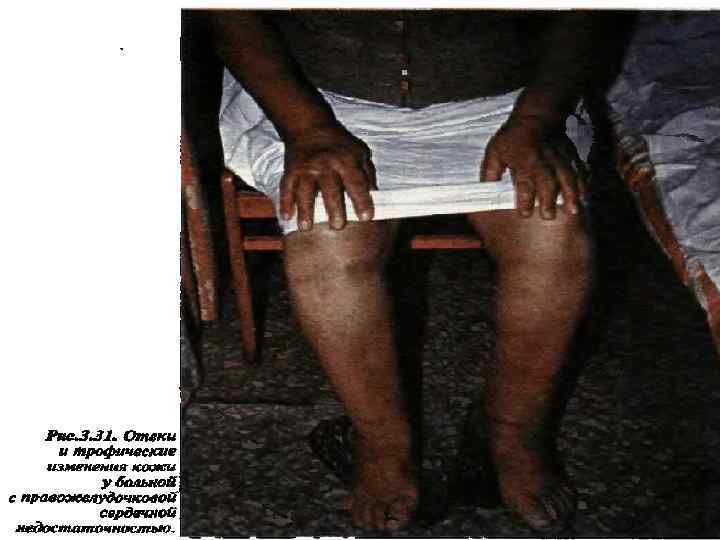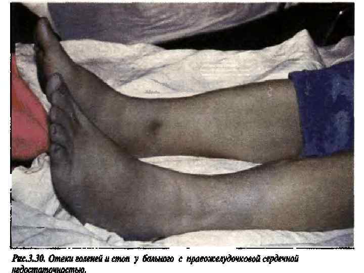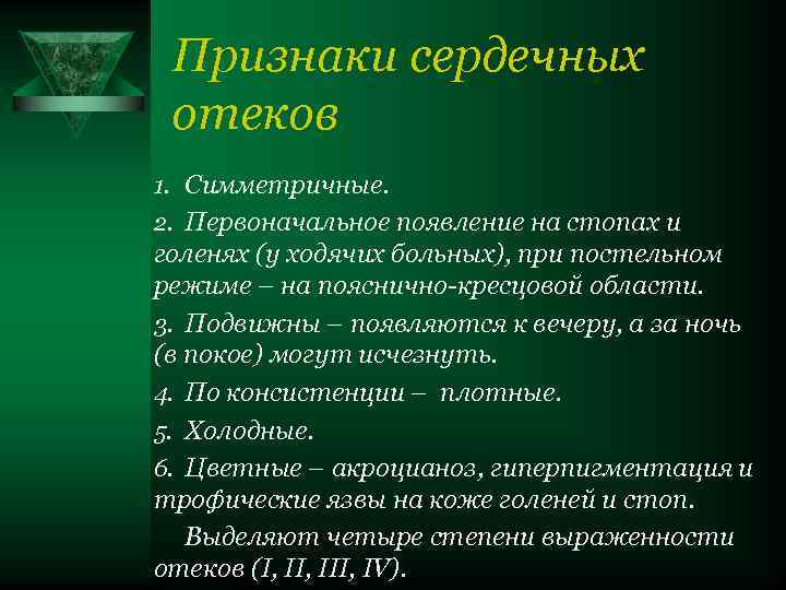 Признаки сердечных отеков 1. Симметричные. 2. Первоначальное появление на стопах и голенях (у ходячих больных), при постельном режиме – на пояснично-кресцовой области. 3. Подвижны – появляются к вечеру, а за ночь (в покое) могут исчезнуть. 4. По консистенции – плотные. 5. Холодные. 6. Цветные – акроцианоз, гиперпигментация и трофические язвы на коже голеней и стоп. Выделяют четыре степени выраженности отеков (I, III, IV).