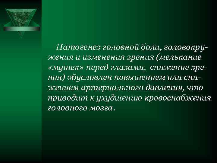 Патогенез головной боли, головокружения и изменения зрения (мелькание «мушек» перед глазами, снижение зрения) обусловлен повышением или снижением артериального давления, что приводит к ухудшению кровоснабжения головного мозга.